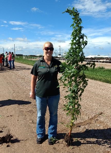 | Stutsman County Extension agent Alicia Harstad with a Palmer Amaranth plant (NDSU Photo) |